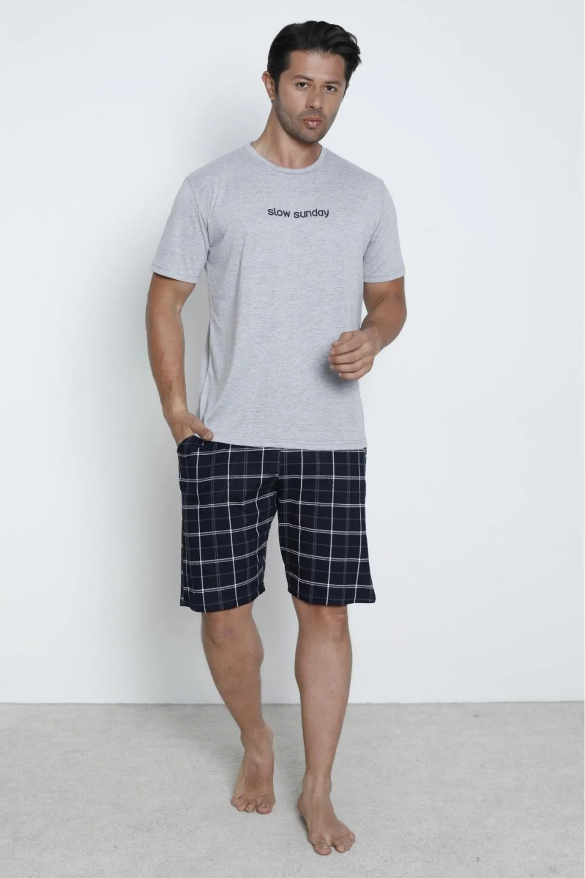 Erkek Şortlu Sıfır Yaka %100 Pamuk Kısa Kol Pijama Takımı GRİ-2XL