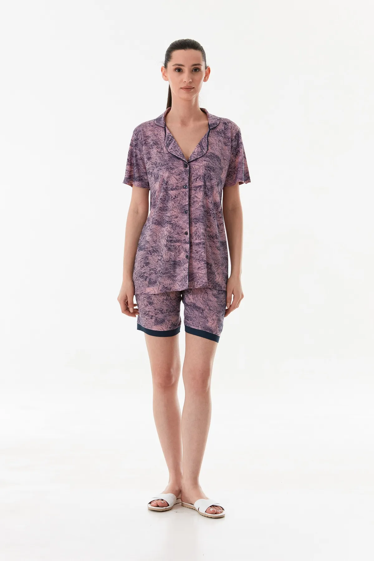 Kadın Şortlu Gömlek Düğmeli Viskon Kumaş Pijama Takımı (Göz Bandı Hediyeli) PEMBE-L